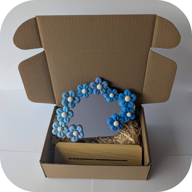 Cloud mirror with a blue ombré of handmade air-dry clay flowers